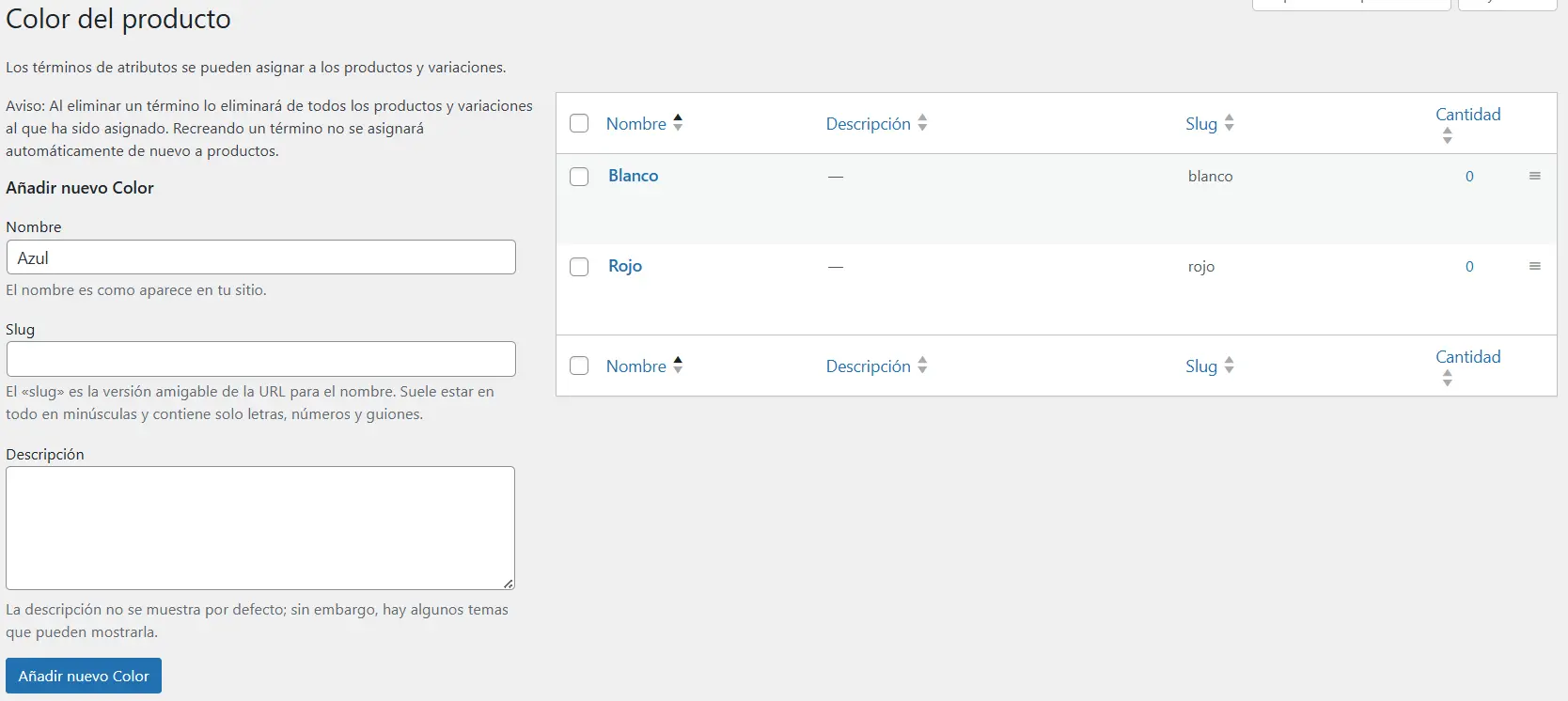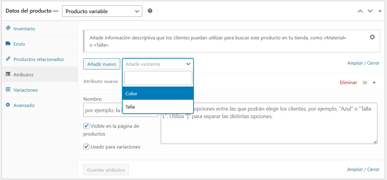 - Repite el proceso para el atributo «Talla«. Al final, guarda los atributos.