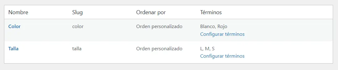 - Ahora, en la lista de la derecha, haz clic en «Configurar términos» para cada atributo. Para «Talla«, añade términos como «S«, «M«, «L«. Para «Color«, añade «Rojo«, «Azul«, «Blanco».