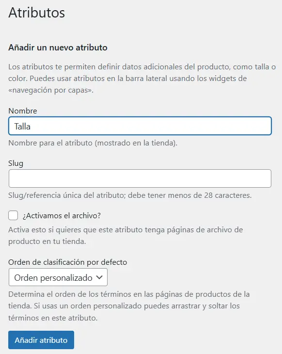 - En la sección «Añadir nuevo atributo«, escribe «Talla» en el campo Nombre y haz clic en «Añadir atributo«.