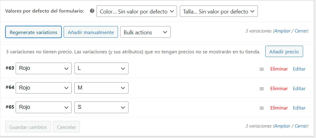 - Aparecerá una alerta. Acepta. WooCommerce creará automáticamente todas las combinaciones posibles (Camiseta Roja Talla S, Camiseta Roja Talla M, etc.).