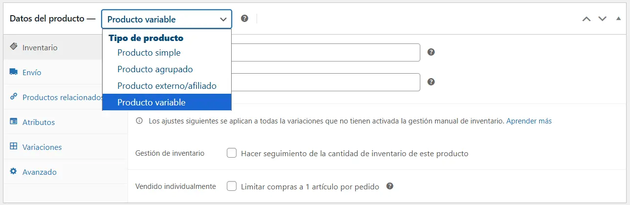 - Haz clic en el menú desplegable que dice «Producto simple» y cámbialo a «Producto variable«. ¡Has activado el modo avanzado!