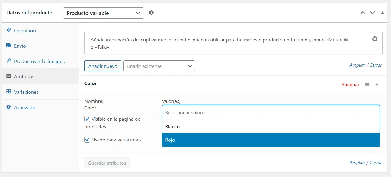 - En la nueva caja de «Color«, haz clic en el campo «Valores» y selecciona los colores que aplican a este producto (ej: Rojo, Azul).
